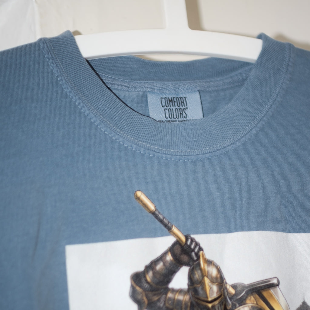 We strictly use pre-shrunk 100% cotton heavyweight blanks for all of our designs which makes for a thick durable tee that feels lived in from day one.